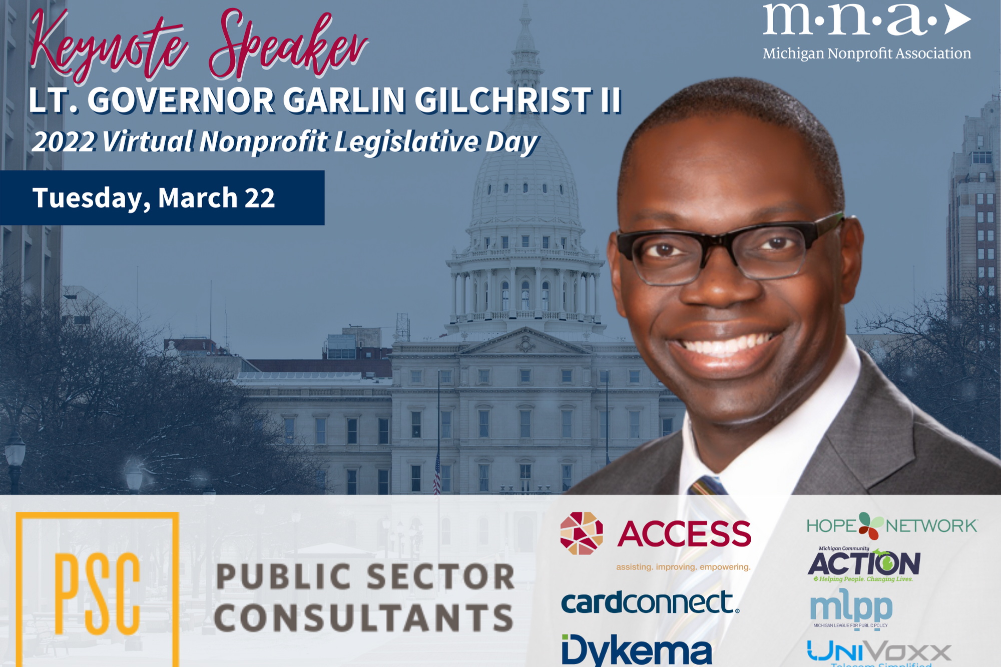 Mark your calendars! Michigan Nonprofit Association’s annual Nonprofit Legislative Day will take place on Tuesday, March 22, 2022 with Lieutenant Governor Garlin Gilchrist is the keynote speaker. We will be holding the event virtually through Zoom. The discussion will center on: Nonprofits- The Best Investment for Community.