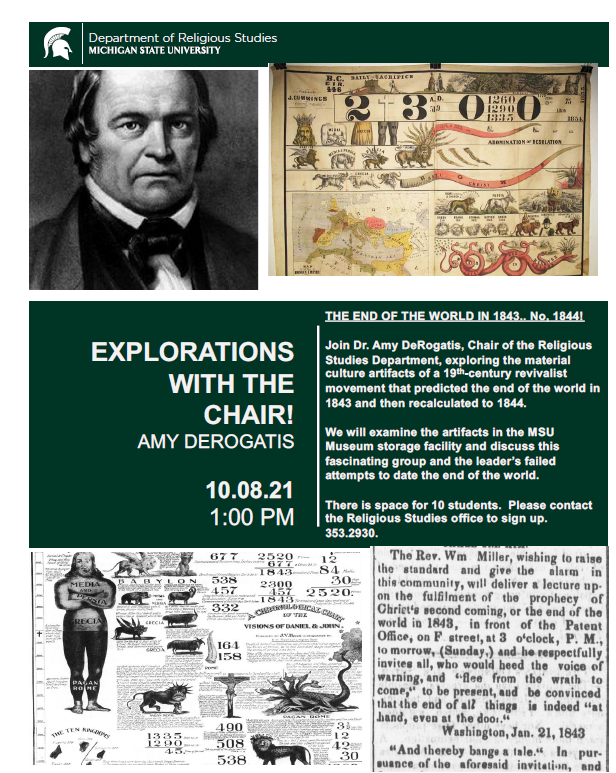 Join Dr. Amy DeRogatis, Chair of the Religious Studies Department, exploring the material culture artifacts of a 19th-century revivalist movement that predicted the end of the world in 1843 and then recalculated to 1844. We will examine the artifacts in the MSU Museum storage facility and discuss this fascinating group and the leader’s failed attempts to date the end of the world.