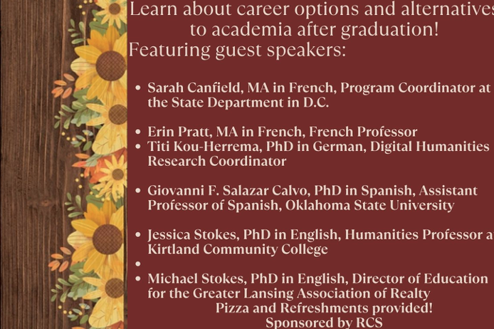 Come learn about career paths inside and outside of Academia for graduate students in the Humanities. This roundtable event, sponsored by Romance and Classical Studies (RCS), features six alumni from RCS, English, and Linguistics, Languages, and Cultures (LiLaC) who will share their valuable experience on the job market and how they succeeded in career paths inside and outside of Academia.