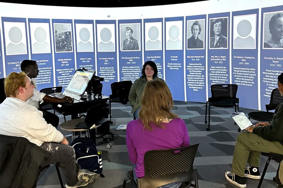 Learn about the women who worked to return art stolen by the Nazis during World War Two in this interactive exhibit! Encounter the 27 Monuments Women in the Main Library’s 360 Degree Visualization Room and explore their stories, through an interactive audio setup.