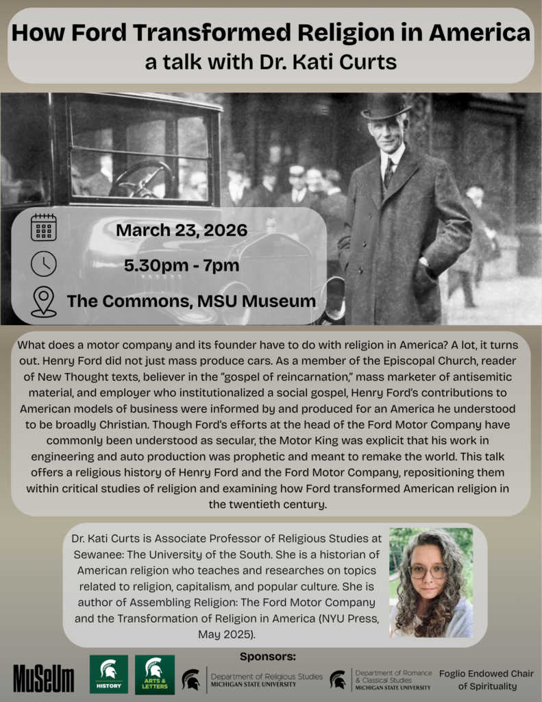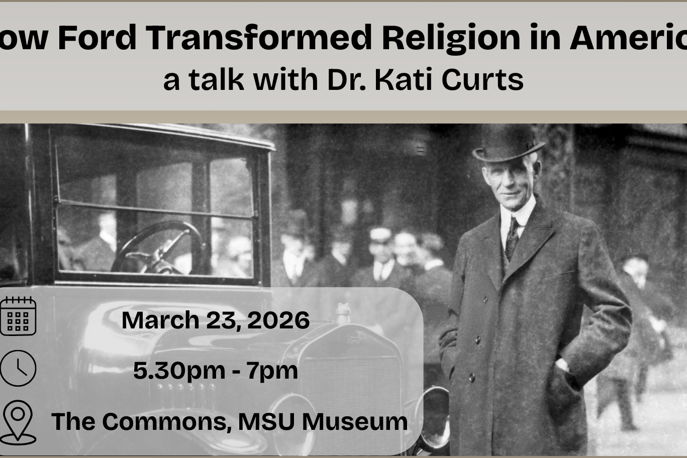 How Ford Transformed Religion in America: a Talk with Dr. Kati Curts + Add to Google Calendar + Add to Outlook / iCal Date Mar 23, 2026 Time 5:30 pm - 7:00 pm Labels Talk Location MSU Museum