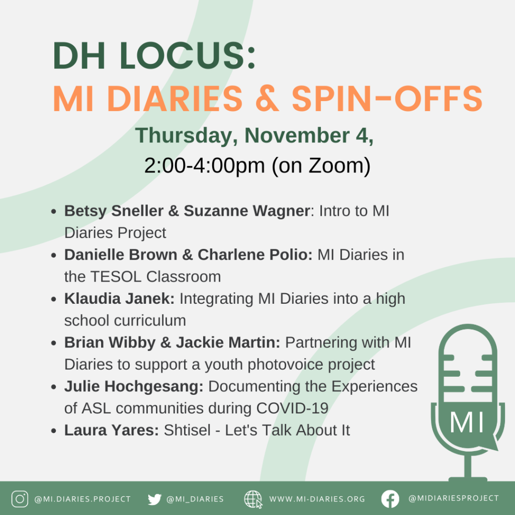 MI Diaries has been collecting self-recorded audio reflections from Michigan residents since the Covid-19 lockdowns began in spring 2020. Participants respond to weekly questions like What are you grateful for this week? and Are there any news stories that have stood out to you lately? MI Diaries was developed to capture the effects of social distancing on everyday language. But it has since proven to be fertile ground for the nurturing of other kinds of research as well. The MI Diaries mobile recording app has been adapted for a study of what people learn about Judaism from watching television. The audio reflections and their transcriptions are being employed to teach learners of English about grammatical structures. Youth participants in a photovoice project have used the app to orally respond to questions related to the images they have captured.