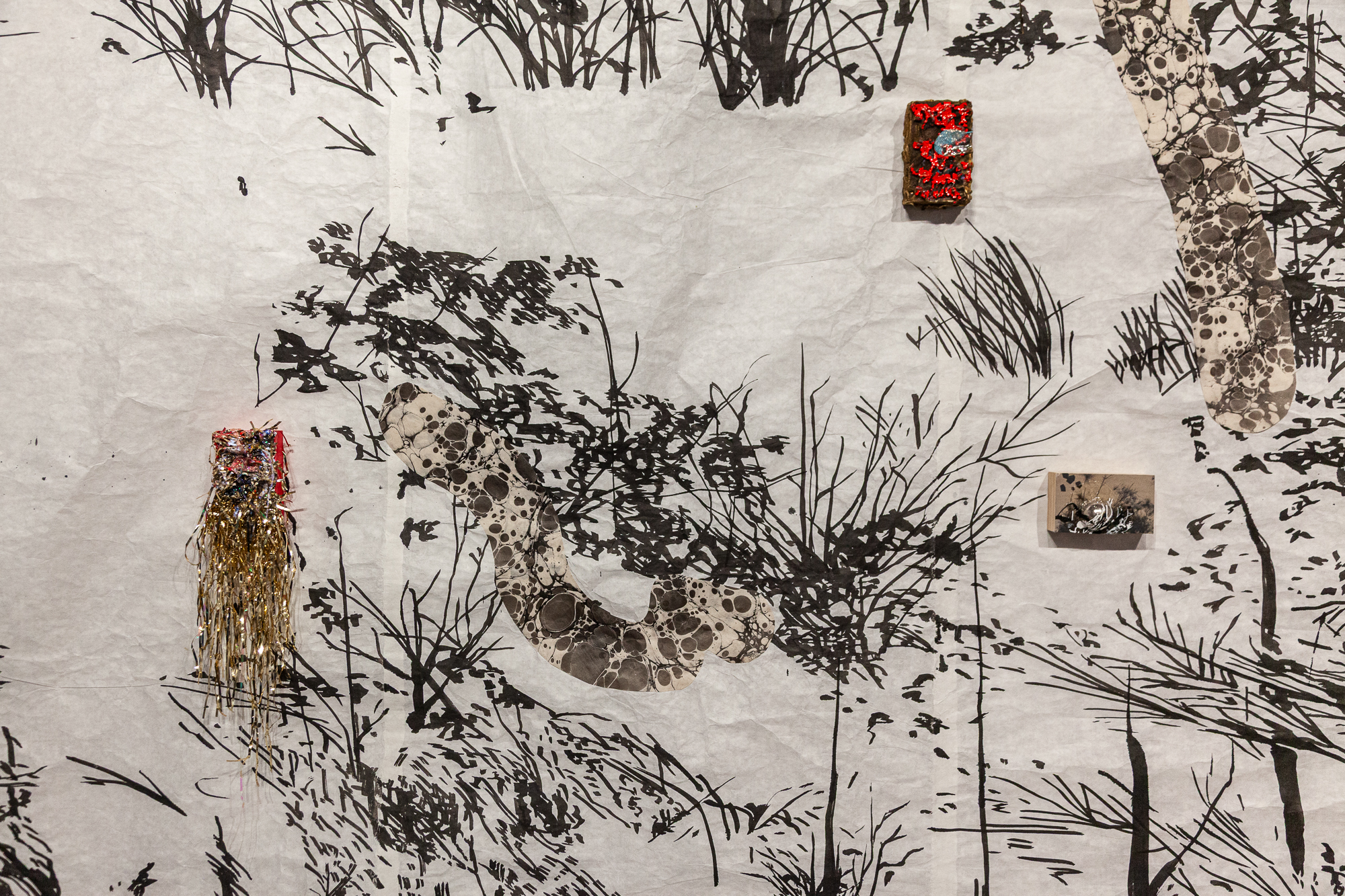 The large hanging ink drawing, Still Grass under the Tower, is a sumi ink work on traditional Chinese mulberry paper. The scroll serves as a backdrop within the installation, echoing the Silk Road trade routes that stretched from Chang’an (modern-day Xi’an, China) to cities along the Mediterranean coast. The small textured paintings positioned atop the image act as static points on a map, marking connections across geography and time. Other works in the exhibition reinterpret elements of Turkish miniature painting and calligraphy, while small travel sketches hang on the wall as fragments of my journey, collecting texture and color studies from historical landmarks such as Hagia Sophia, Dolmabahçe Palace, the Basilica Cistern, and the Ephesus Archaeological Site.