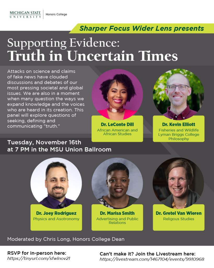 Join a panel discussion, moderated by Dean of the Honors College, Chris Long to explore questions of seeking, defining and communicating “truth.”